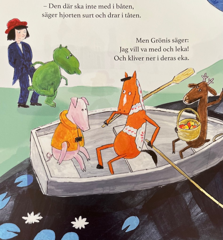 Och nu. Precis när Per och Knall och jag iklädda regnbyxor och gummistövlar tagit oss ner till den blottlagda havsbottnen för att – klivande runt i vår egen skit – försöka baxa ut båten i vattnet, så kommer en eka full med ungjävlar glidande som från ingenstans och saktar in.
